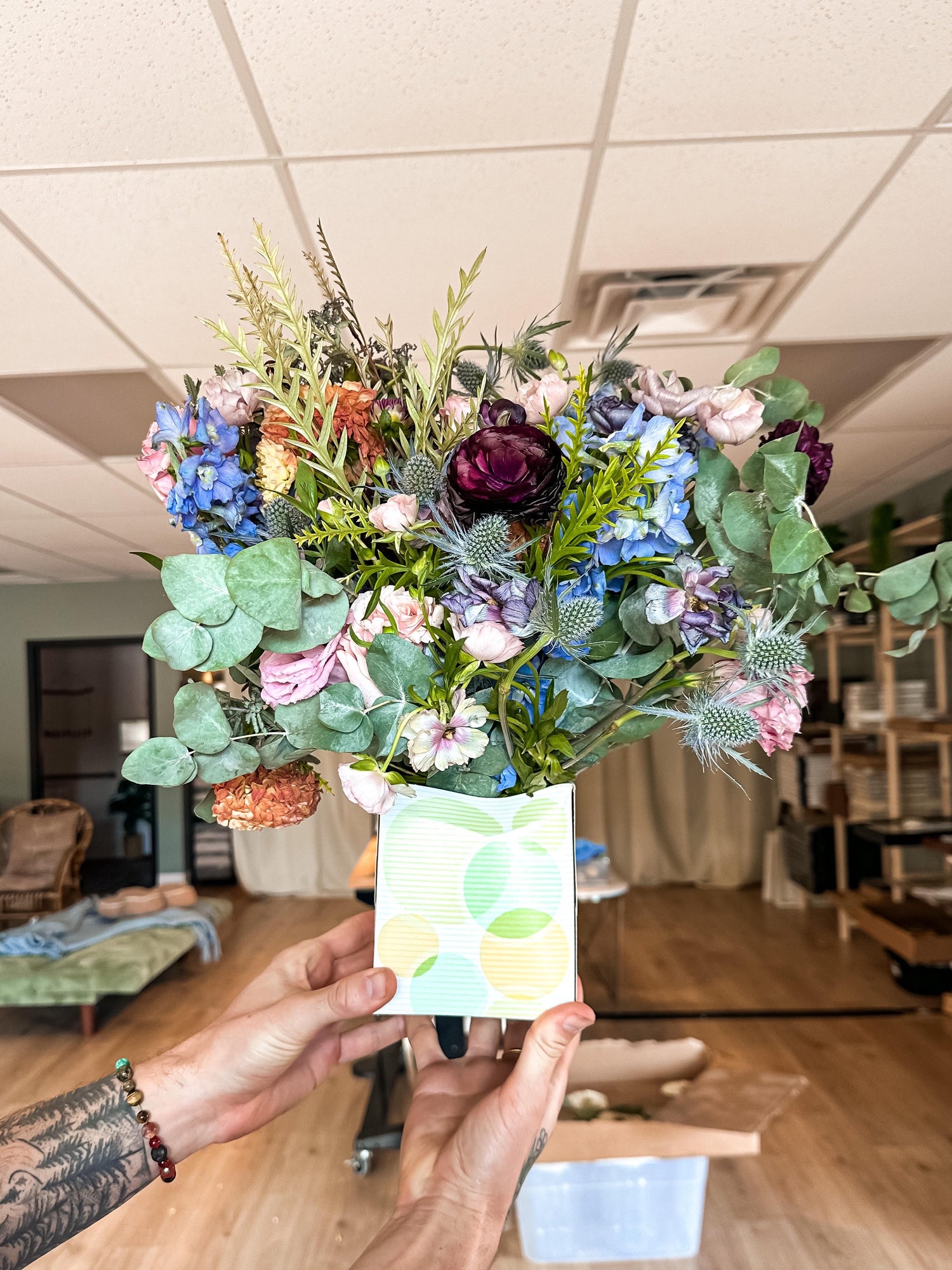 Secure your small box to the bottom of a larger box & surround with packing materials. Again, making sure to leave your florals exposed!