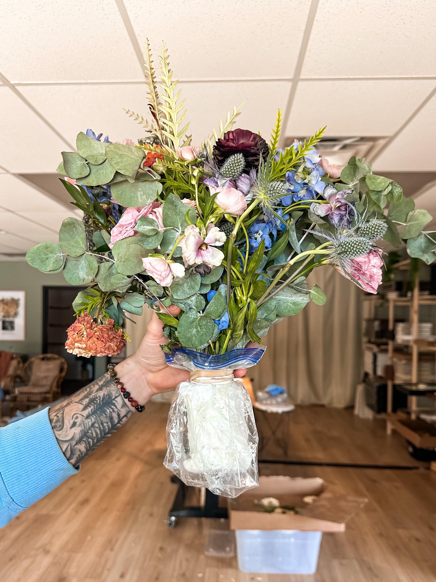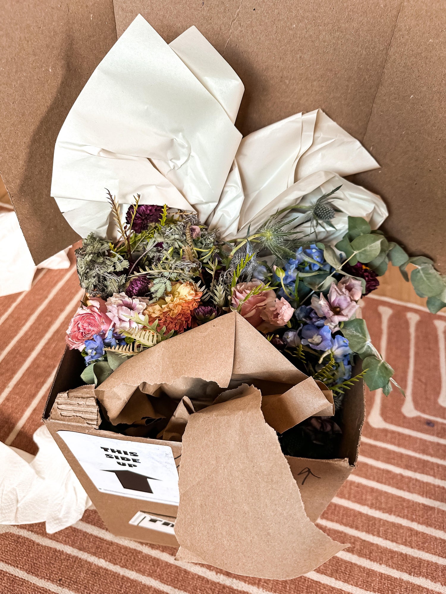 Keep your florals upright inside a smaller box. For example, a tissue box or solo cup. Do not enclose your flowers in anyway. They will mold... TRUST ME.
